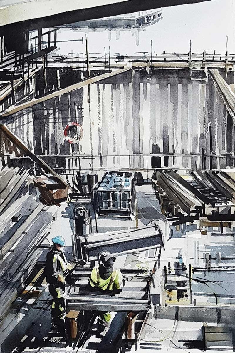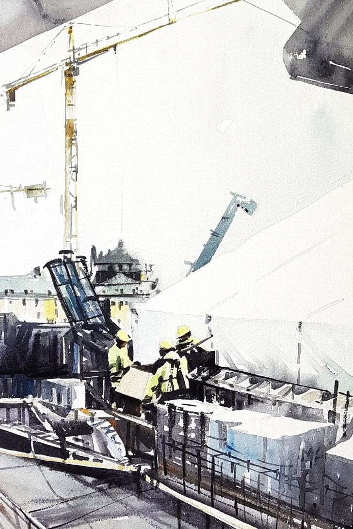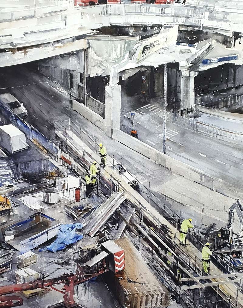 In fall 2026, this work will be exhibited at Karby Gård in Täby, Stockholm. The exhibition will showcase how I’ve captured the evolving landscape of Slussen through watercolor—a medium not typically associated with concrete, steel, and construction machinery. I find the contrast between the rough materiality of the scenes and the delicacy of the watercolor medium fascinating and enticing.